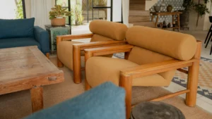 Gunakan sofa dengan rangka kayu jati, meja kopi berbahan kayu solid, atau rak buku kayu terbuka untuk menciptakan atmosfer hangat. -